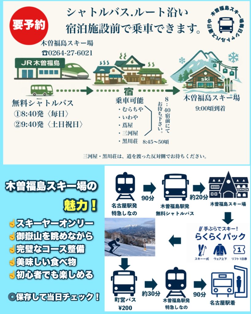 ・名古屋駅 → 特急しなの(約90分)→ JR木曽福島駅・JR木曽福島駅 → 無料シャトルバス(約20分)→ 木曽福島スキー場無料シャトルバス発車時刻・8:40発(毎日)・9:40発(土日祝・年末年始)🏨 宿泊施設からの途中乗車について(要予約)シャトルバスのルート沿い宿泊施設から、途中乗車が可能です。※必ず事前予約をお願いいたします。途中乗車可能な宿泊施設・むらちゃ・いわや・おん宿蔦屋・三河屋・黒川荘※三河屋・黒川荘は道路を渡った反対側での乗車となります。🔁 お帰りについて帰りの無料シャトルバスはありません。スキー場 → JR木曽福島駅は**町営バス(有料200円/約30分)**をご利用ください。