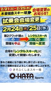 2/21(土)〜2/25(水)開催予定の木曽福島スキー場 NEW MODEL試乗会ですが、諸事情により第2クワッドリフト横での開催を中止し、「レンタルスキー内」での開催へ変更させていただきます。開催日程・時間に変更はございません。