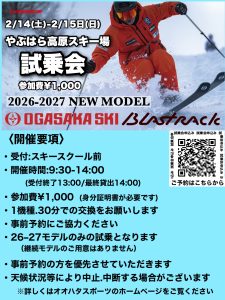 26-27NEW OGASAKASKI&BLASTRACK試乗会㏌やぶはら高原スキー場 2026年2月5日 最終更新日時 : 2026年2月5日 オオハタスポーツ webmaster Follow me! お問い合わせご依頼及び業務内容へのご質問等お気軽にお問い合わせください4月~10月/日曜日 定休日・11月~3月日曜日営業 ※1月1日~3日定休日 0264-22-2497受付時間:平日9:00~18:30/日曜祝日9:00~18:00 FacebookXHatenaPocketCopy